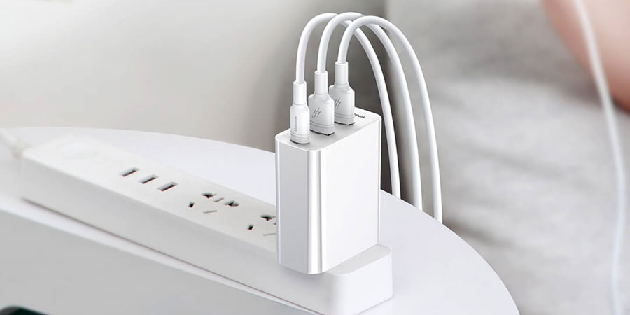 Baseus 3-port 60W fast charger features three output ports, two USB-A ports and a USB-C port. The charger can be used to charge laptops and mobile phones at the same time.