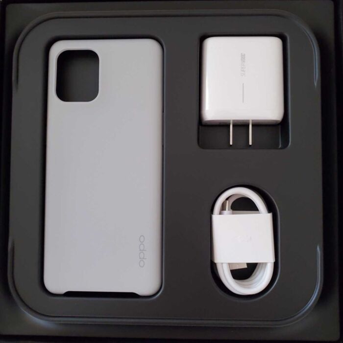 - The package includes an OPPO 65W SuperVOOC Flash Charge, cable, and a protective case.